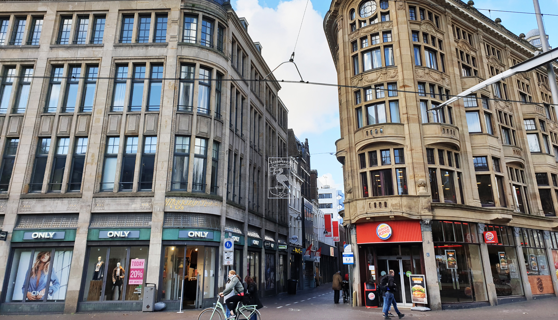 Op de hoek van de Spuistraat en het Spui zat Magazijn Nederland. Dit bedrijf werd al in 1856 in Amsterdam opgericht door L.A. Kattenburg. Kattenburg had tien zonen die allen in de zaak kwamen te werken, zodat er filialen in diverse steden in Nederland ontstonden. In een van hun advertenties is te zien dat ze ‘gemaakte kleding’ verkochten. Dit betekent dat ze confectie leverden, waar ze zich als een van de eerste detailhandels op toelegden. In 1915 mochten de architecten Simons & Van Braningen een heel nieuw pand voor het Magazijn Nederland ontwerpen. Boven de ingang op de hoek zie je nog steeds in gouden letters de naam van deze winkel.