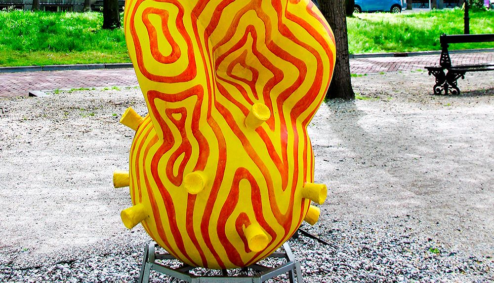 Vanuit de Parkstraat bezien, start de expositie met het viereneenhalve meter hoge beeld van Van Lier. De roestkleurige plaat staal heeft in het midden een forse opening, je kijkt dwars door het werk naar de bomen en de lucht, je ziet de schaduw en het licht, de zon, kortom: wat is weggelaten, lijkt alsof het is toegevoegd. Aan de andere kant van het Lange Voorhout sluit het forse geelkleurige werk ‘Verweving’ van Rinus Roelofs de serie af. De samengestelde, wiskundige constructies van Roelofs hebben wel wat gemeen met het werk van Escher in het Paleisje, een paar meter verder.
