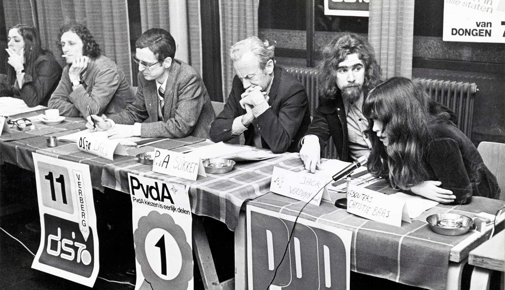 Forum-bijeenkomst van de politieke partijen. V.r.n.l.: Christy Baas (Kabouters), Jack Verduyn Lunel (PPR), Slikker (PvdA), W. Drees jr. (DS’70). Foto uit 1974, Robert Scheers, collectie HGA -