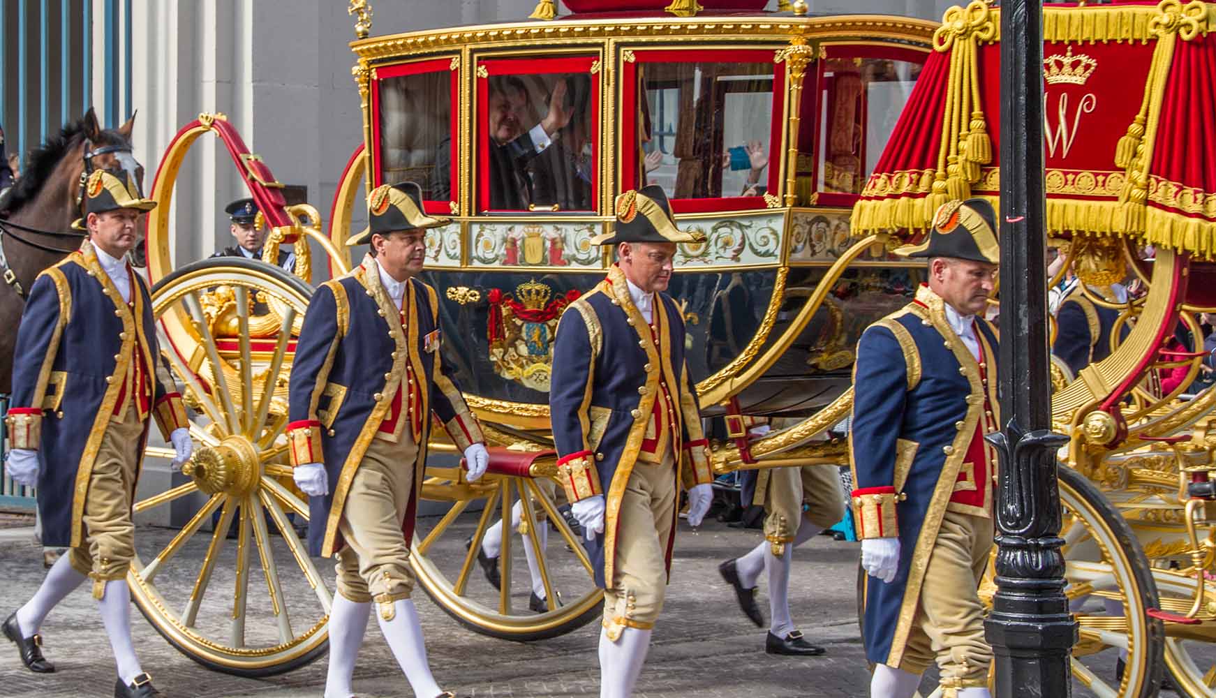 Aan weerszijden van de Glazen Koets lopen lakeien met tweekantige steken op het hoofd. Prinsjesdag 2017. Foto: Harry van Reeken, collectie HGA -