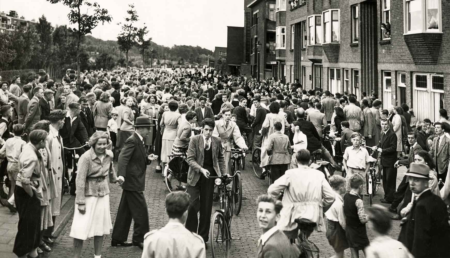 Drukte op straat uit belangstelling voor het spook in het huizenblok in de Paets van Troostwijkstraat. Foto: Friezer-Stokvis, collectie HGA -