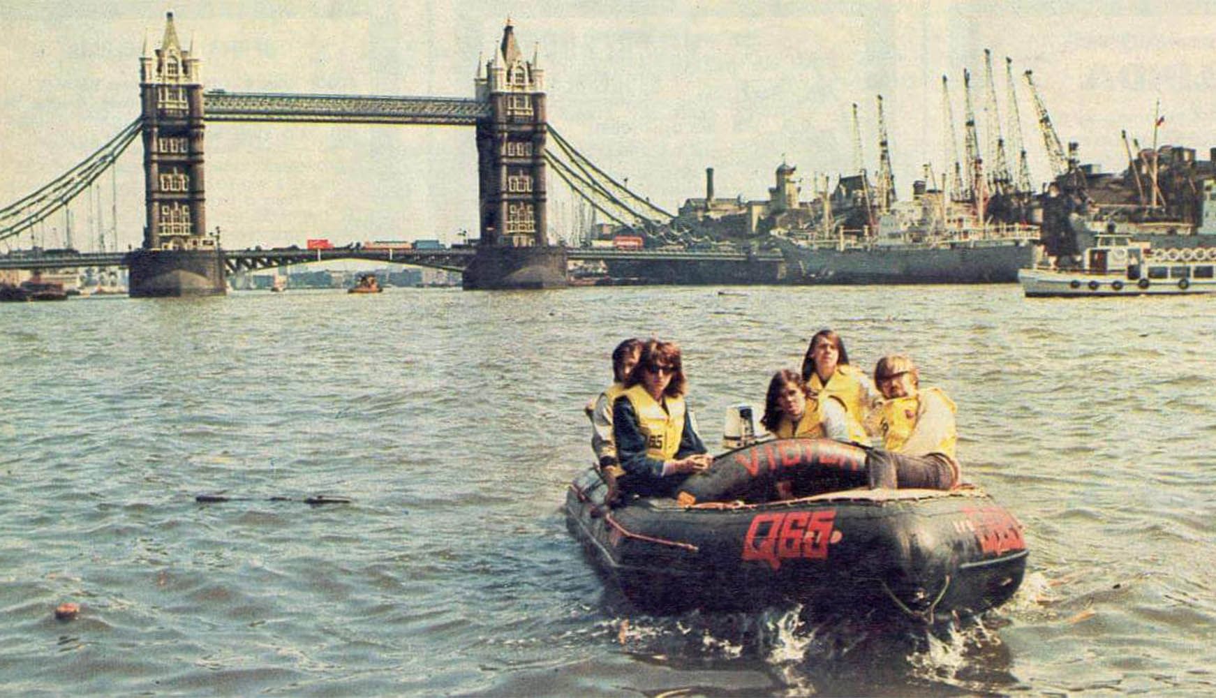 Op 3 juli 1966 vertrekt de band met de volgboot, de ex-mijnenveger de Zilvermeeuw, vanuit Muiden naar Londen. De Konink-lijke Nederlandse Reddingsmaatschappij (KNRM) had een rubberboot beschikbaar gesteld, die op het achterdek klaarlag voor de geplande terugtocht. In Londen zou worden opgetreden in de hippe beatclub The Tiles, maar bij aankomst bleek niemand eraan gedacht te hebben een werkvergunning aan te vragen. Het optreden ging dus niet door, tot grote frustratie van de Kjoe. Wel deden zij nog wat interviews en foto shoots. De volgende dag vertrok de band met de rubberboot over de Theems richting Nederland. Om toch nog wat aan promotie te doen, deed het bootje in de monding van de Theems de Engelse piratenzender Radio City aan. Radio City zond uit vanaf fort Shivering Sands, een voormalige luchtafweerbasis uit de Tweede Wereldoorlog. Volgens Frank Nuyens waren het “een aantal ijzeren containers op heel hoge palen”. Wim Bieler wist later nog te vertellen dat “iedereen met een vreselijk eng touwladdertje naar boven moest klimmen”.